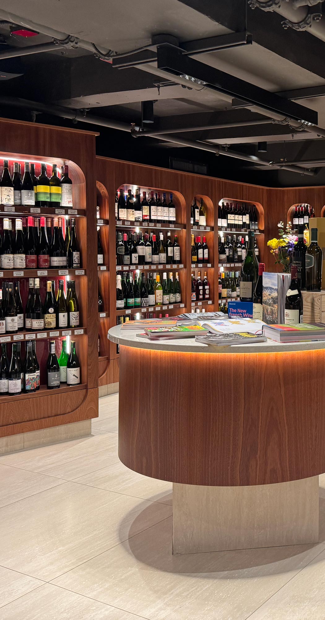 Penn Cellars’ design reflects a commitment to craftsmanship and functionality. Our studio carefully balanced the challenges of the space—such as its 7’2” ceiling height—with thoughtful details that enhance both aesthetics and usability. The dark brown ceiling evokes the ambiance of an underground wine cellar, while warm mahogany millwork, inspired by 20th-century train cars, creates a timeless and welcoming atmosphere. Modular shelving systems bring flexibility and highlight the store’s expertly curated collection.