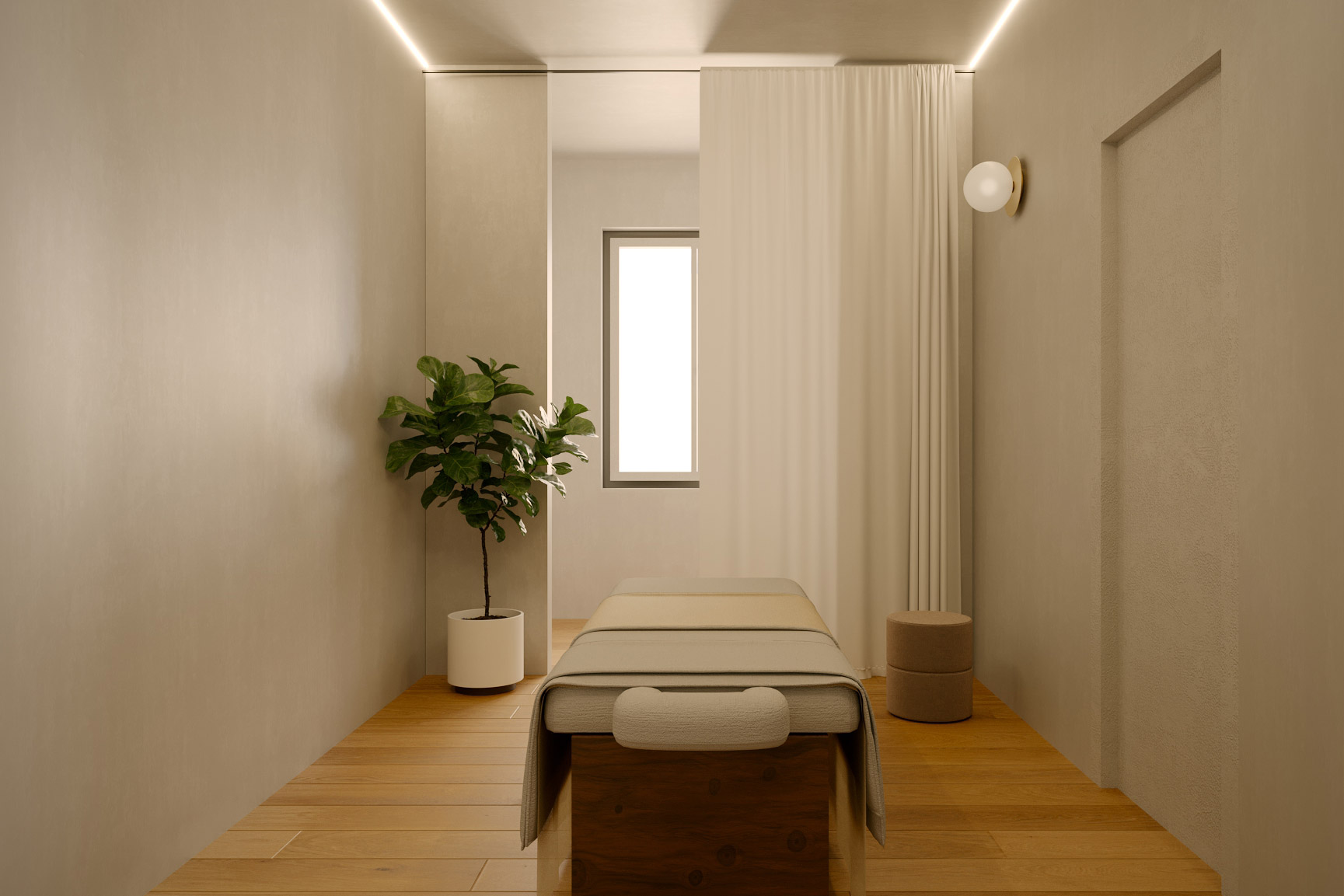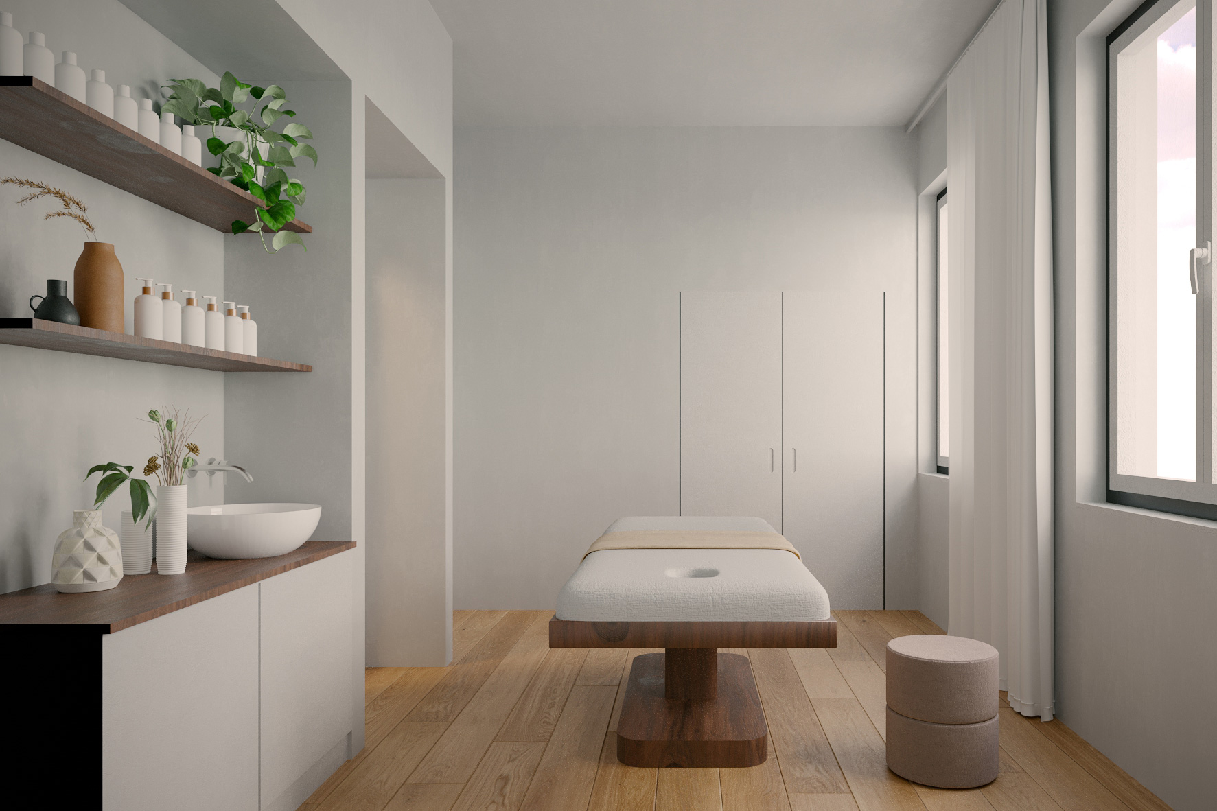 Day Spa unfolds as a choreographed sequence of sculpted spaces, where soft-edged volumes and gently curving surfaces rigorously calibrate sensory stimuli to elicit deep physiological responses. Guided by a “body & space” manifesto and grounded in contemporary neuroscience research, each threshold, corner and aperture is strategically composed to modulate natural light, scent and spatial perception, forging a seamless dialogue between occupant and environment.