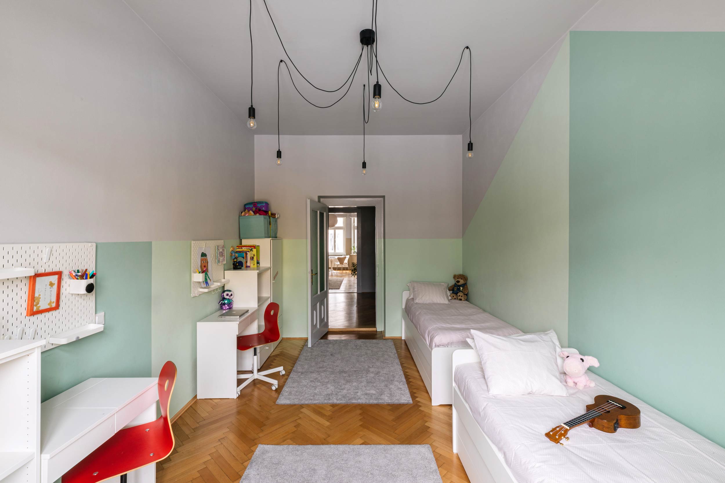 The vibrant color scheme, loosely inspired by the symbolic use of color at Adolf Loos’ Muller Villa nearby, reinforces the general sense of symmetry of the layout while creating a visual connection among the rooms when seen through the thresholds. The original herringbone wood floor and the double doors were restored. At areas where flooring was missing, we specified a matching maple wood floor laid out at a 45-degree angle, to differentiate it from the historical one.