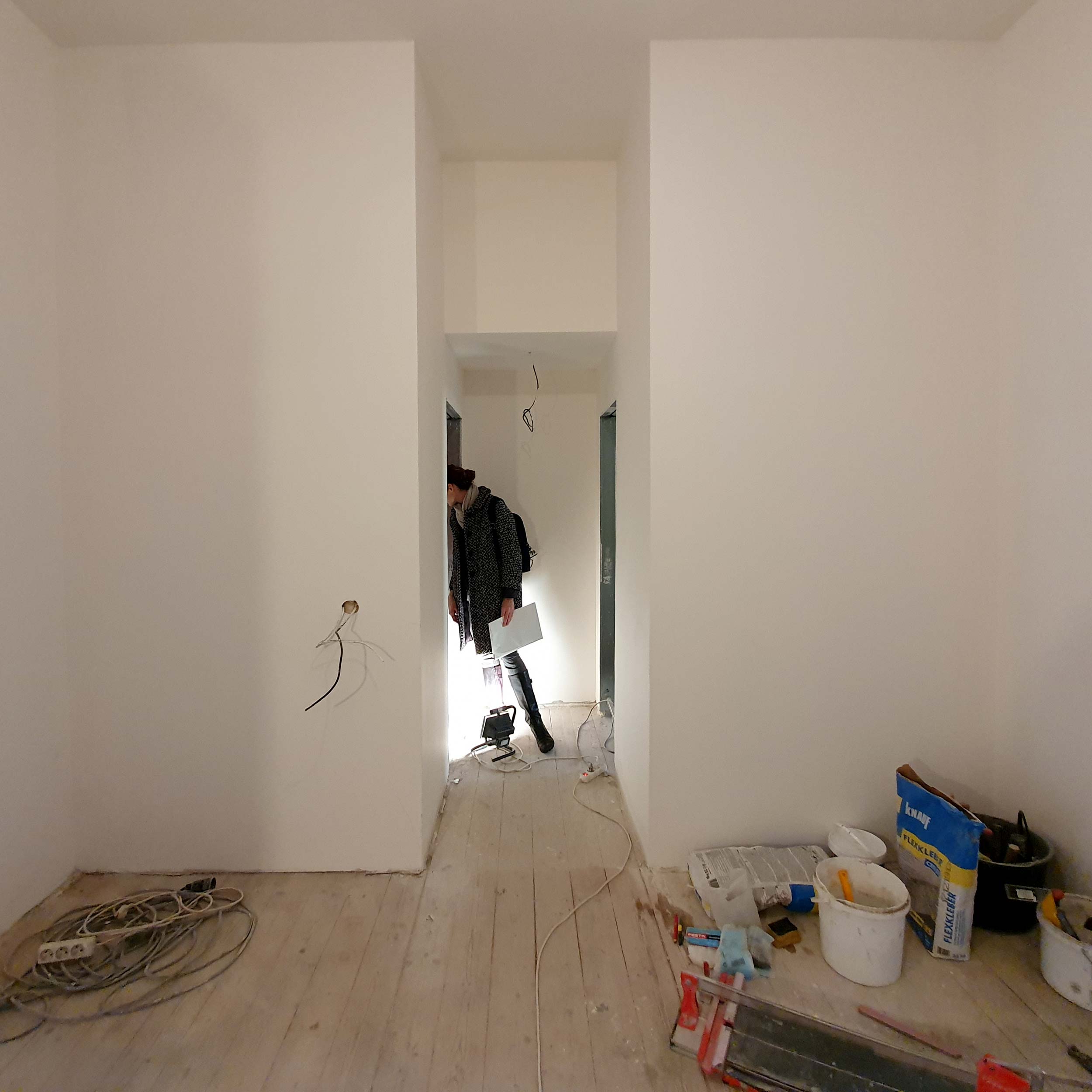 The original layout of this apartment in the center of Prague had four rooms organized around a large entry vestibule–a typical configuration for this typology of elegant residences in the city center. The kitchen, previously situated in the upper right quadrant, was disconnected from the living area and the only bathroom, opened into the entry hall with a door adjacent to the kitchen door. Moreover, the entry hall felt too large a space to have no access to natural light.