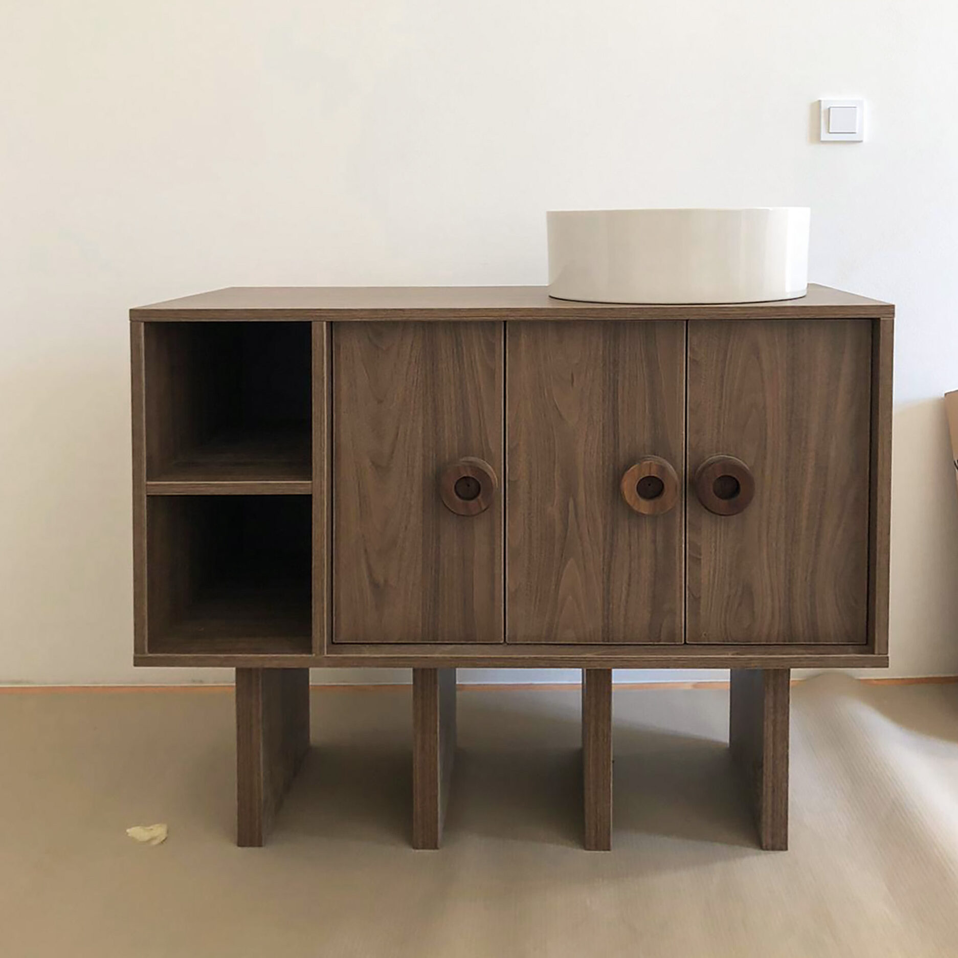 The new configuration introduces two abstract and perfectly symmetrical volumes connected by a cube, reducing the size of the entry vestibule. These volumes contain two bathrooms, one used for guests and the kids, and another accessible from within the master suite. The kitchen is moved to the upper left quadrant and has direct access to the living room.